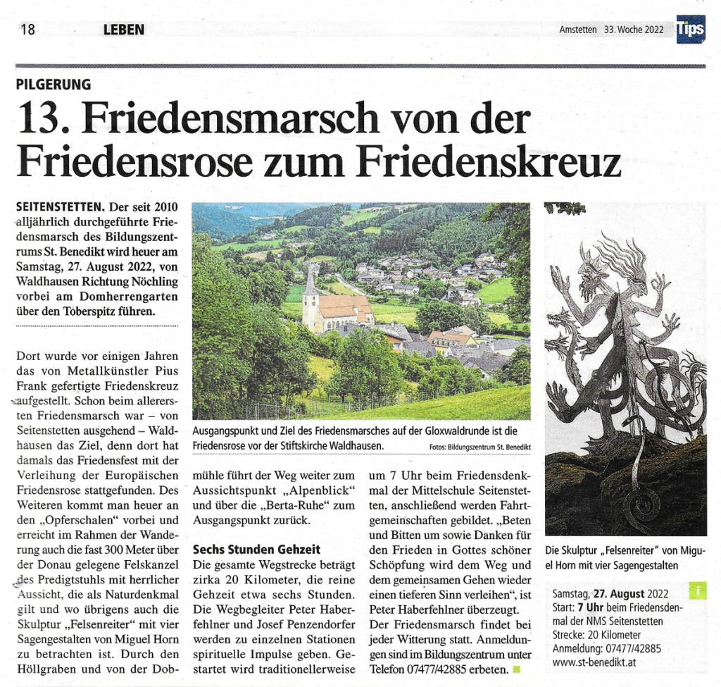 Der seit 2010 alljährlich durchgeführte Friedensmarsch des Bildungszentrums St. Benedikt wird heuer am Samstag den 27. August 2022, von Waldhausen Richtung Nöchling, vorbei am Domherrengarten über den Toberspitz führen.